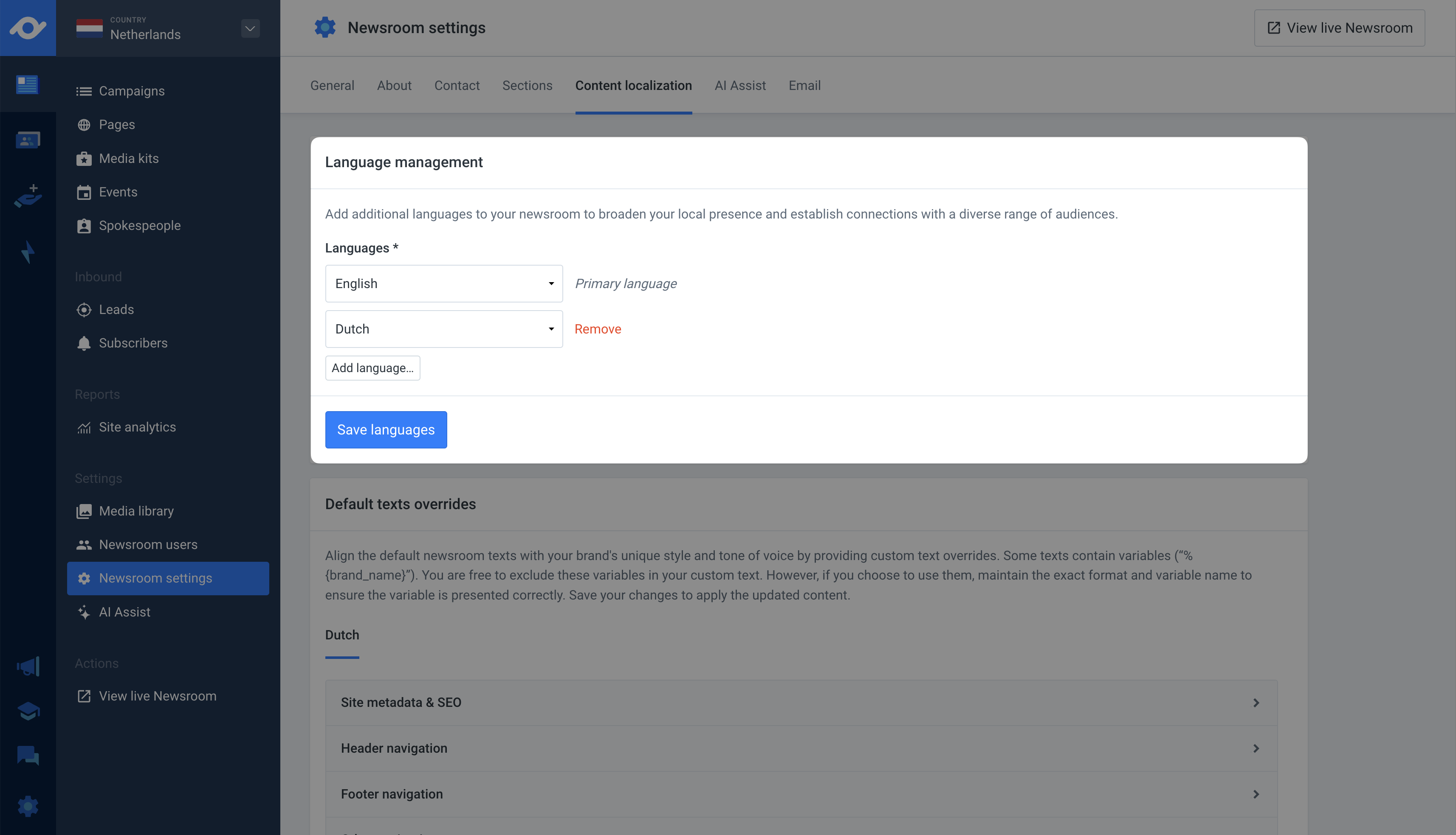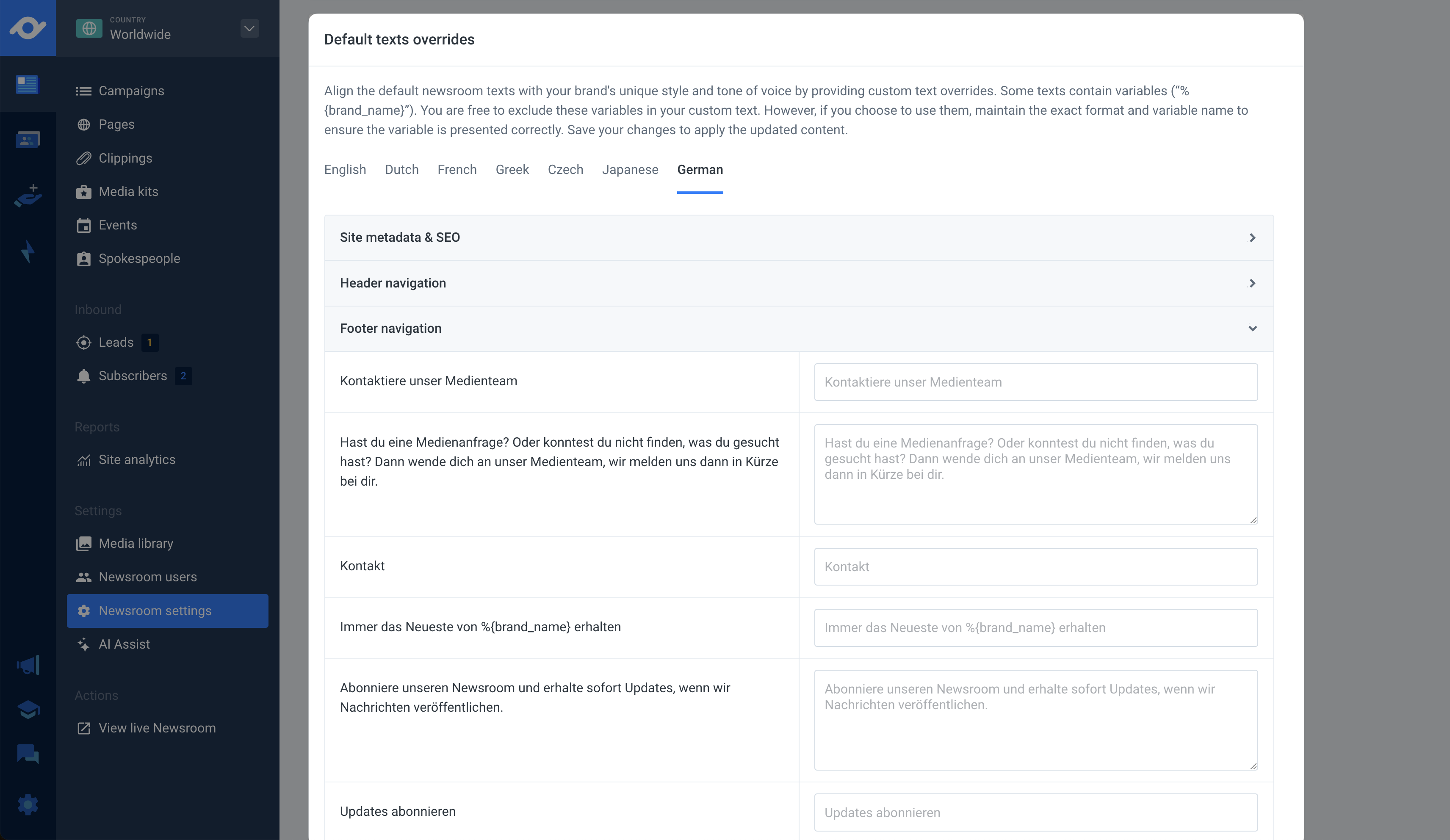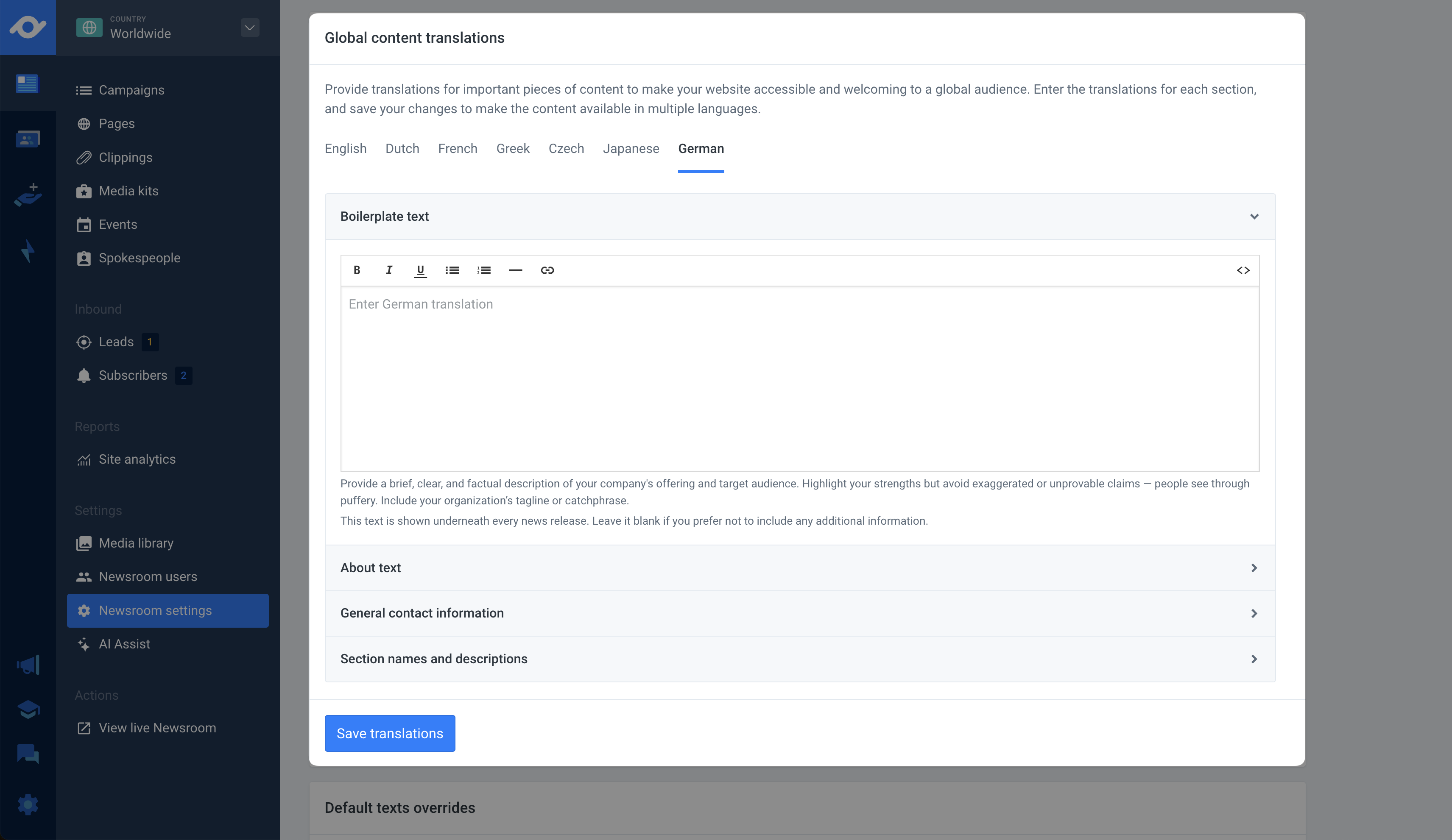 Ready to localize your content? Just head to your Newsroom settings and click on the Content localizations tab. Any updates you make will be applied to your newsroom instantly.