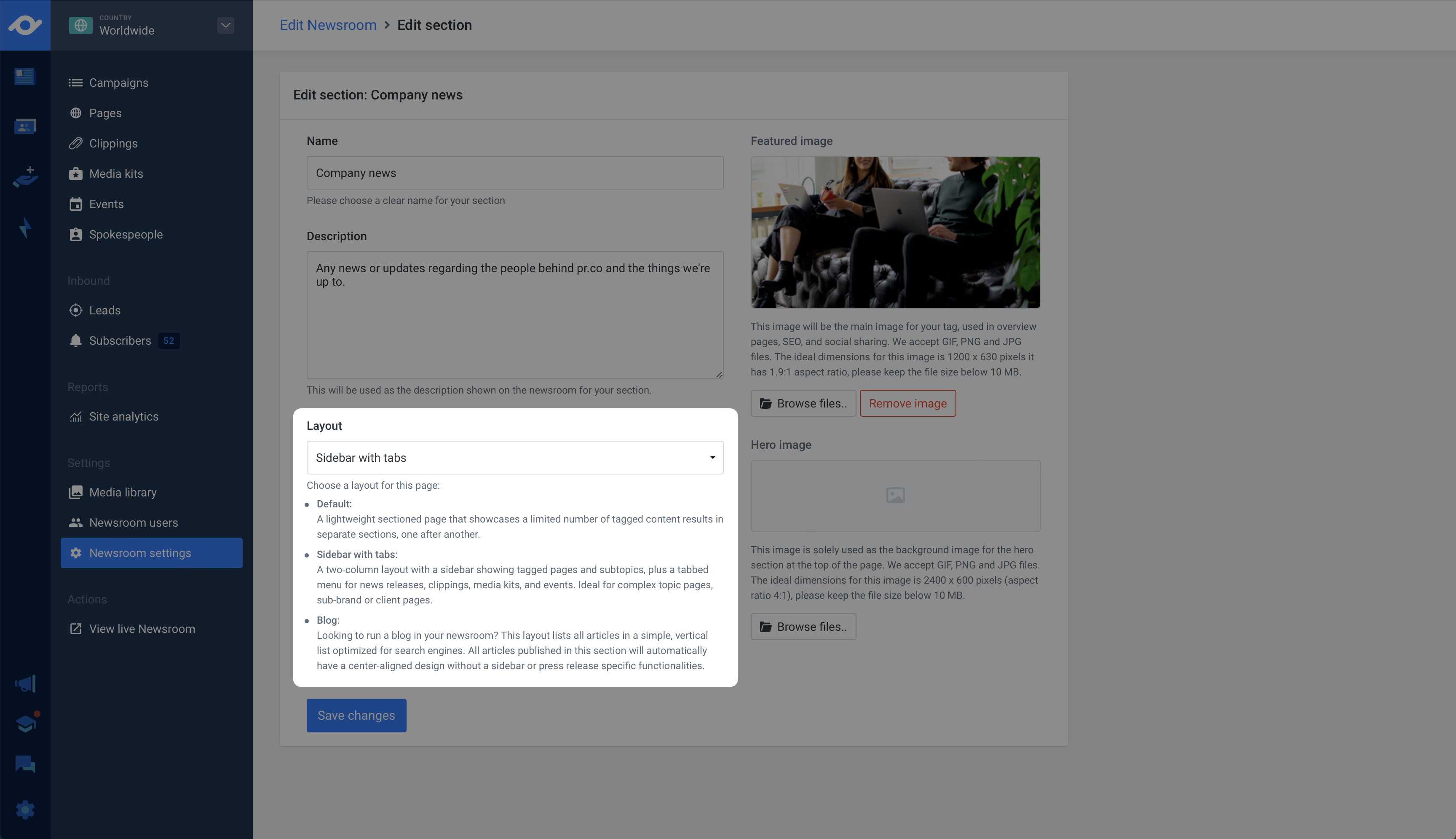 - (New) Blog: Looking to run a blog in your newsroom? This layout lists all articles in a simple, vertical list optimized for search engines. All articles published in this section will automatically have a center-aligned design without a sidebar or press release specific functionalities.